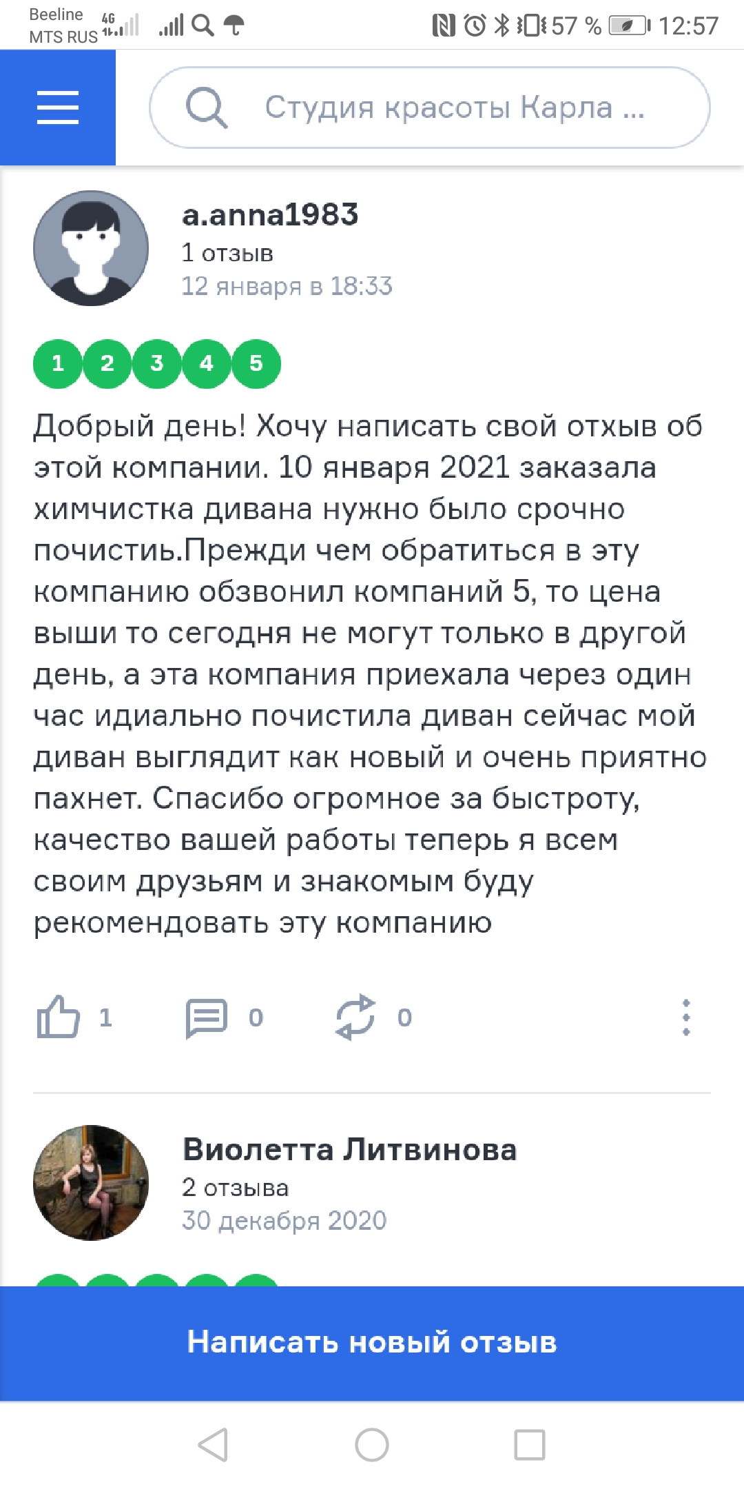 Добрый день! Хочу написать свой отхыв об этой компании. 10 января 2021 заказала химчистка дивана нужно было срочно почистиь. эта компания приехала через один час идиально почистила диван