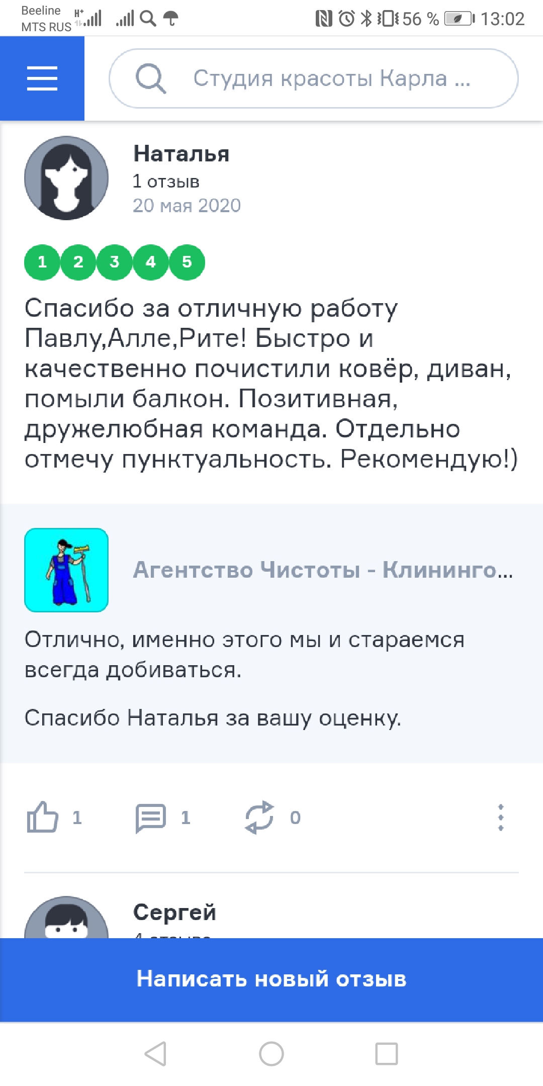 Спасибо за отличную работу Павлу,Алле,Рите! Быстро и качественно почистили ковёр, диван, помыли балкон. Позитивная, дружелюбная команда. Отдельно отмечу пунктуальность. Рекомендую!)