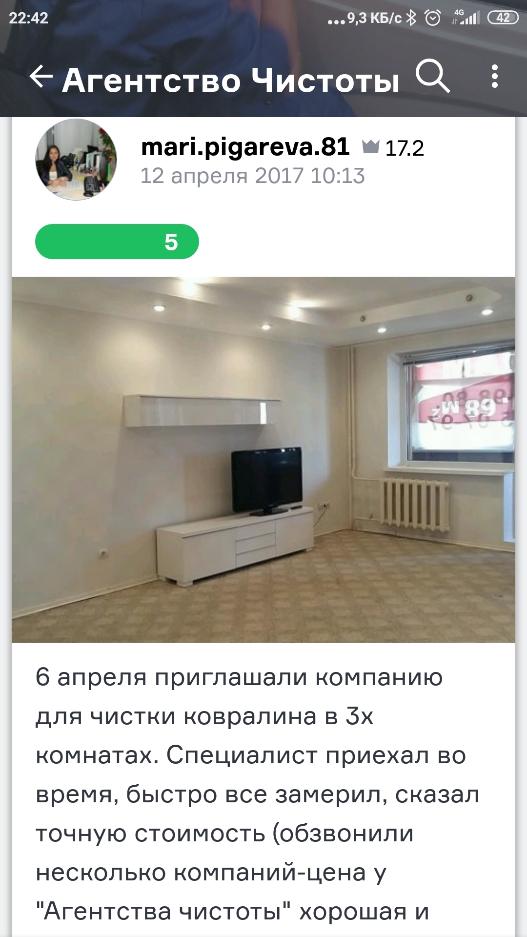 6 апреля приглашали компанию для чистки ковралина в Зх комнатах. Специалист приехал во время, быстро все замерил, сказал точную стоимость (обзвонили несколько компаний-цена у "Агентства чистоты" хорошая.