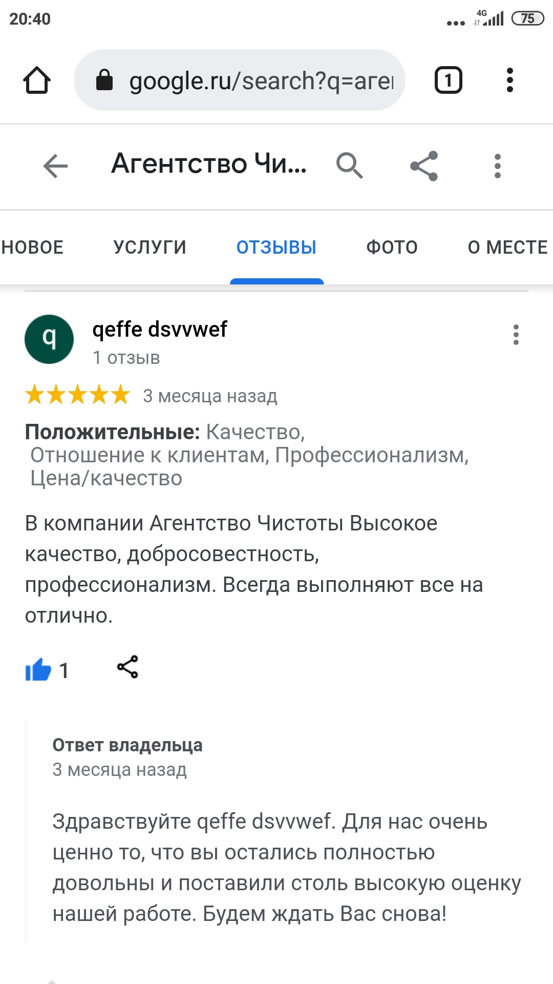 В компании Агентство Чистоты Высокое качество, добросовестность, профессионализм. Всегда выполняют все на отлично.
