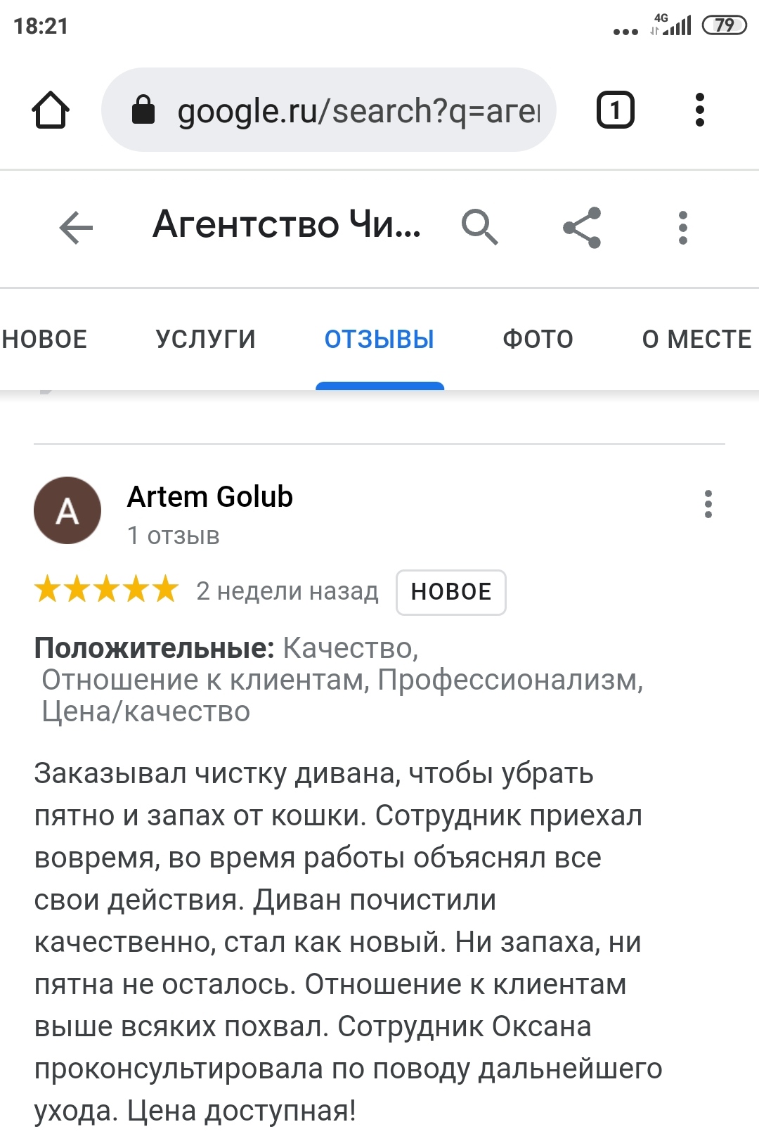 Заказывал чистку дивана, чтобы убрать пятно и запах от кошки.Диван почистили качественно, стал как новый. Ни запаха, ни пятна не осталось. Отношение к клиентам выше всяких похвал. Сотрудник Оксана проконсультировала по поводу дальнейшего ухода.