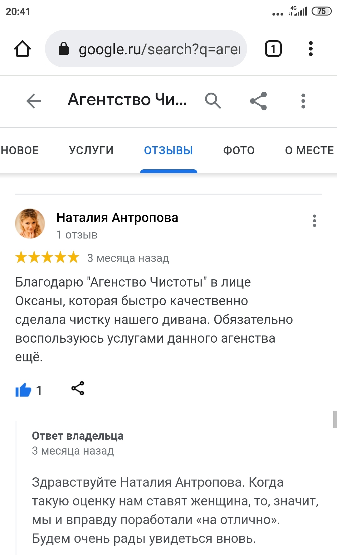 Благодарю "Агенство Чистоты" в лице Оксаны, которая быстро качественно сделала чистку нашего дивана. Обязательно воспользуюсь услугами данного агенства ещё.