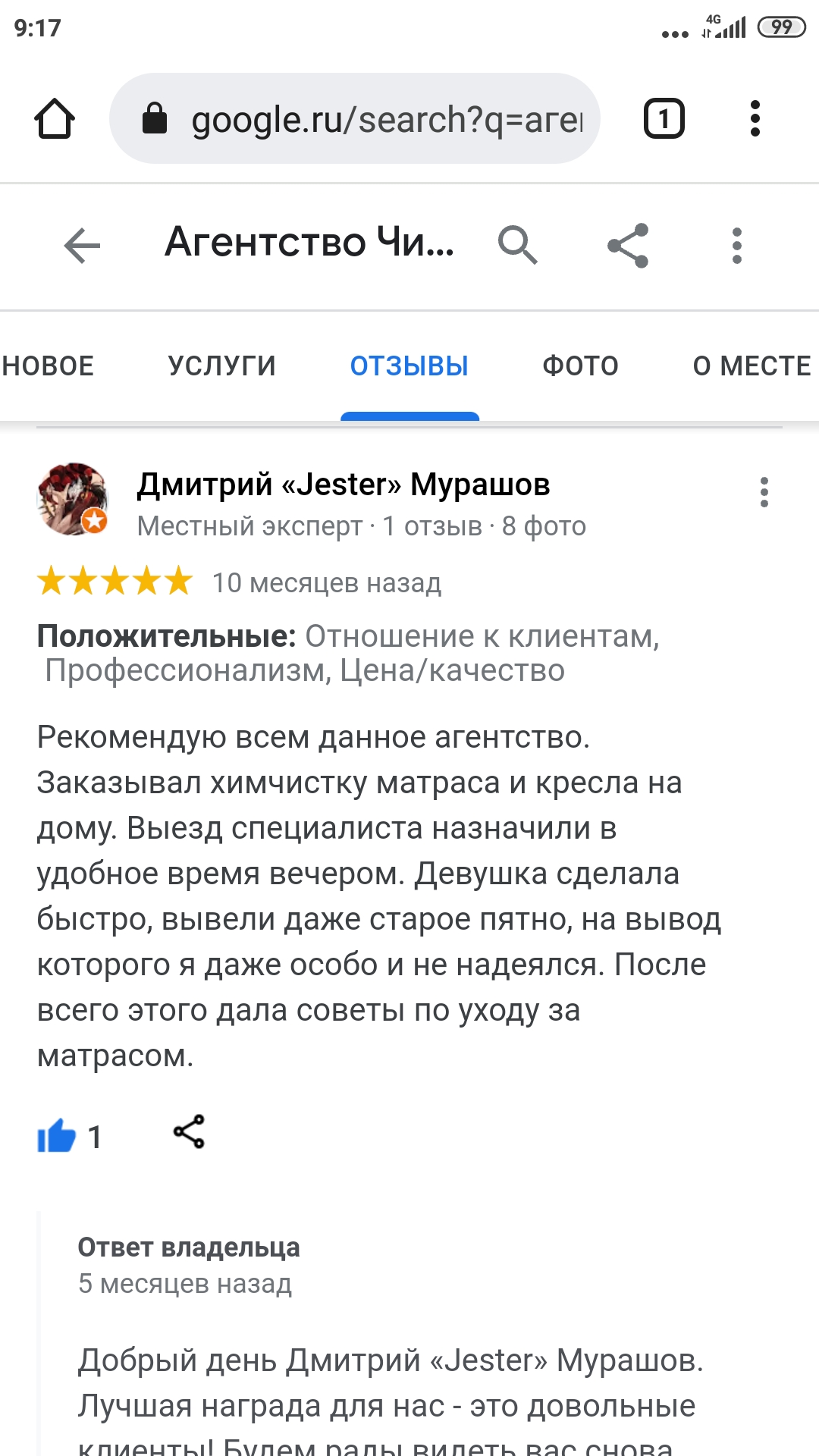 Рекомендую всем данное агентство. Заказывал химчистку матраса и кресла на дому. Выезд специалиста назначили в удобное время вечером. Девушка сделала быстро, вывели даже старое пятно, на вывод которого я даже особо и не надеялся.