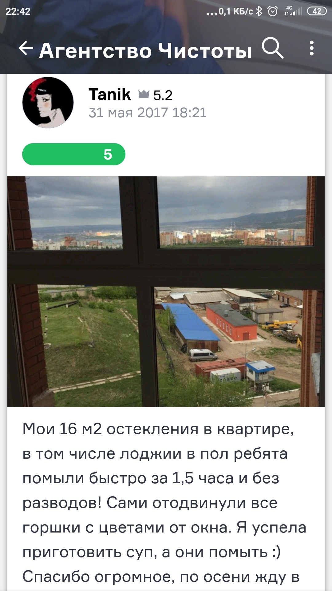Мои 16 м2 остекления в квартире, в том числе лоджии в пол ребята помыли быстро за 1,5 часа и без разводов! Сами отодвинули все горшки с цветами от окна. Я успела приготовить суп, а они помыть :) Спасибо огромное, по осени жду.