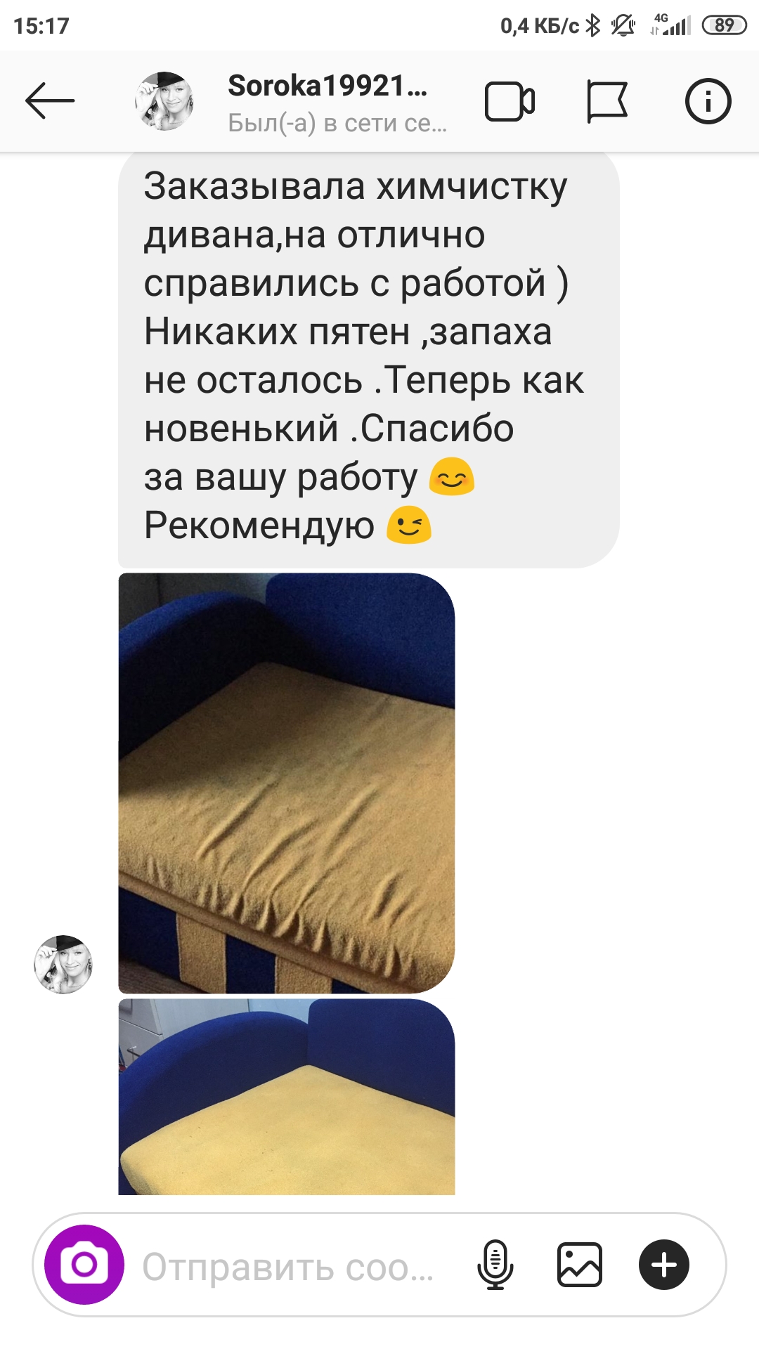 Заказывала химчистку дивана,на отлично справились с работой) Никаких пятен,запаха не осталось .Теперь как новенький.Спасибо за вашу работу - Рекомендую