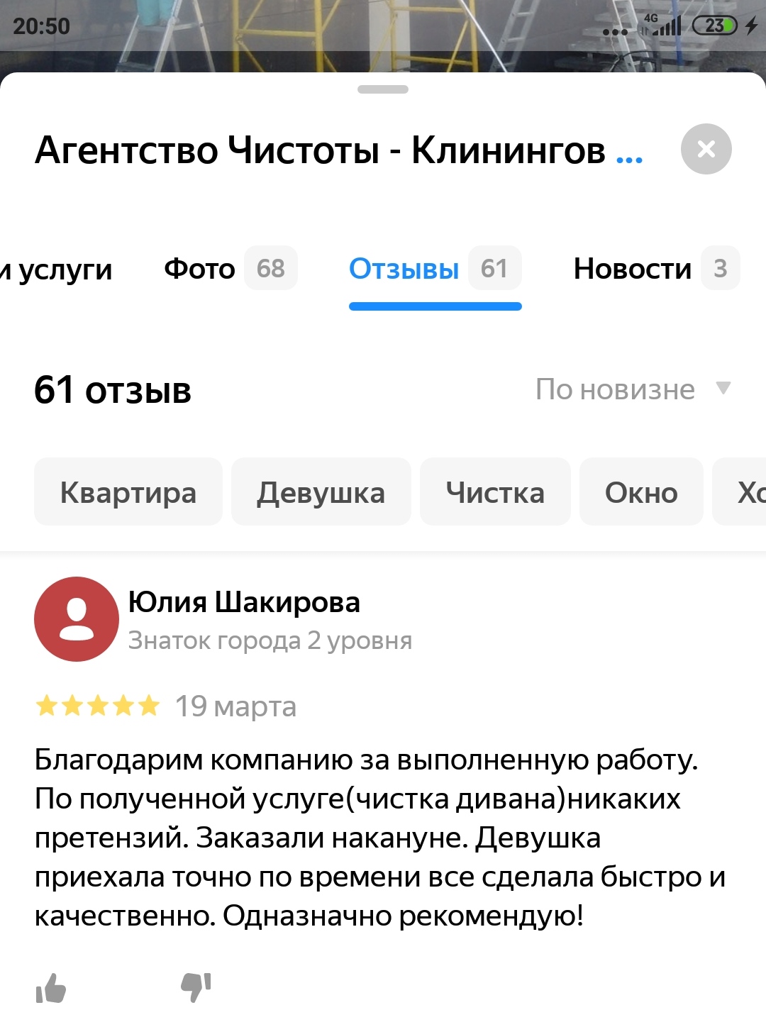 Благодарим компанию за выполненную работу. По полученной услуге(чистка дивана)никаких претензий. Заказали накануне. Девушка приехала точно по времени все сделала быстро и качественно. Одназначно рекомендую!