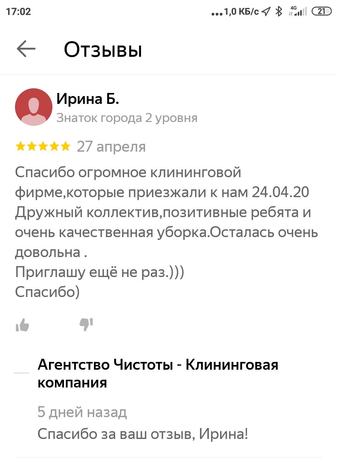 Спасибо огромное клининговой фирме,которые приезжали к нам 24.04.20 Дружный коллектив,позитивные ребята и очень качественная уборка.Осталась очень довольна.