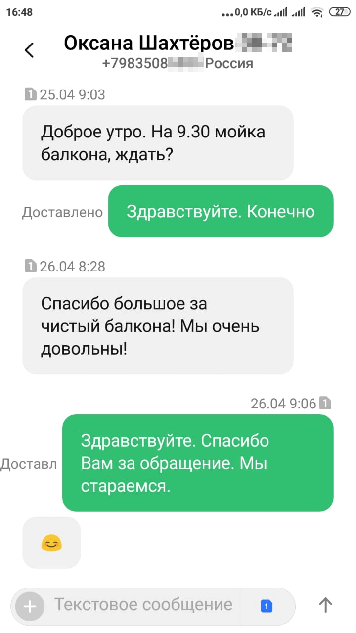 Спасибо большое за чистый балкона! Мы очень довольны!