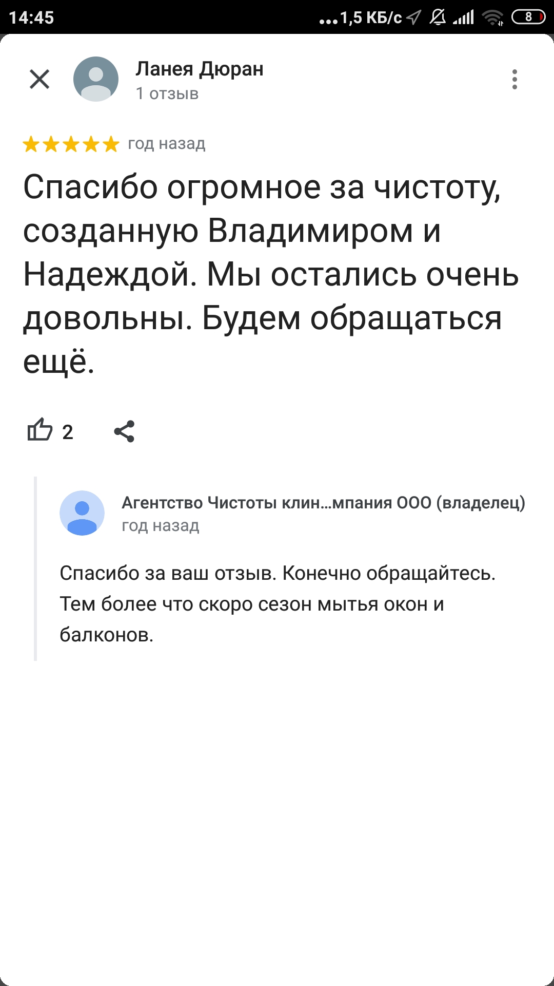 Спасибо огромное за чистоту, созданную Владимиром и Надеждой, Мы остались очень довольны. Будем обращаться ещё.