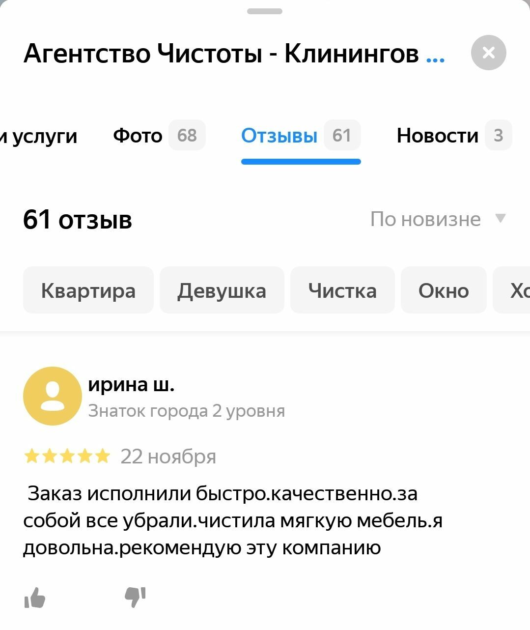 Заказ исполнили быстро.качественно.за собой все убрали.чистила мягкую мебель.я довольна.рекомендую эту компанию