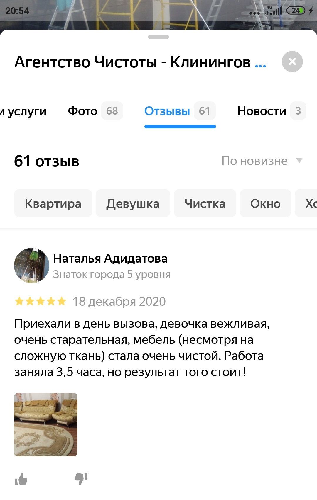 Приехали в день вызова, девочка вежливая, очень старательная, мебель (несмотря на сложную ткань) стала очень чистой. Работа заняла 3,5 часа, но результат того стоит!