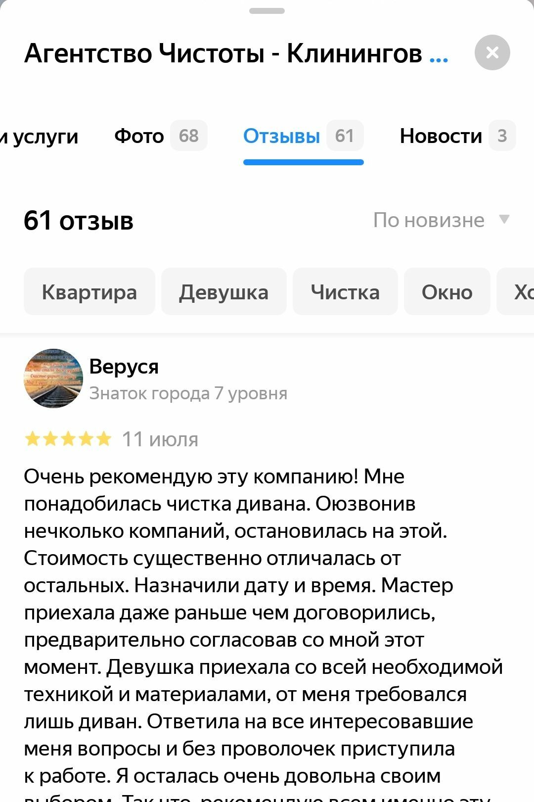 Очень рекомендую эту компанию! Мне понадобилась чистка дивана. Девушка приехала со всей необходимой техникой и материалами, от меня требовался лишь диван. Ответила на все интересовавшие меня вопросы .Я осталась очень довольна своим