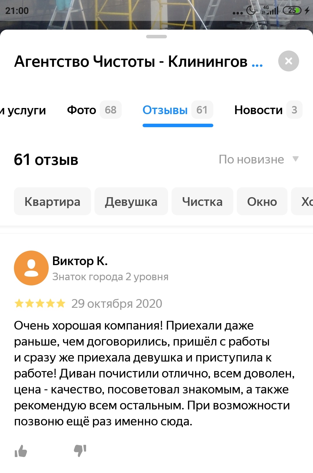 Очень хорошая компания! Приехали даже раньше, чем договорились, пришёл с работы и сразу же приехала девушка и приступила к работе! Диван почистили отлично, всем доволен, цена - качество, посоветовал знакомым, а также рекомендую всем остальным.