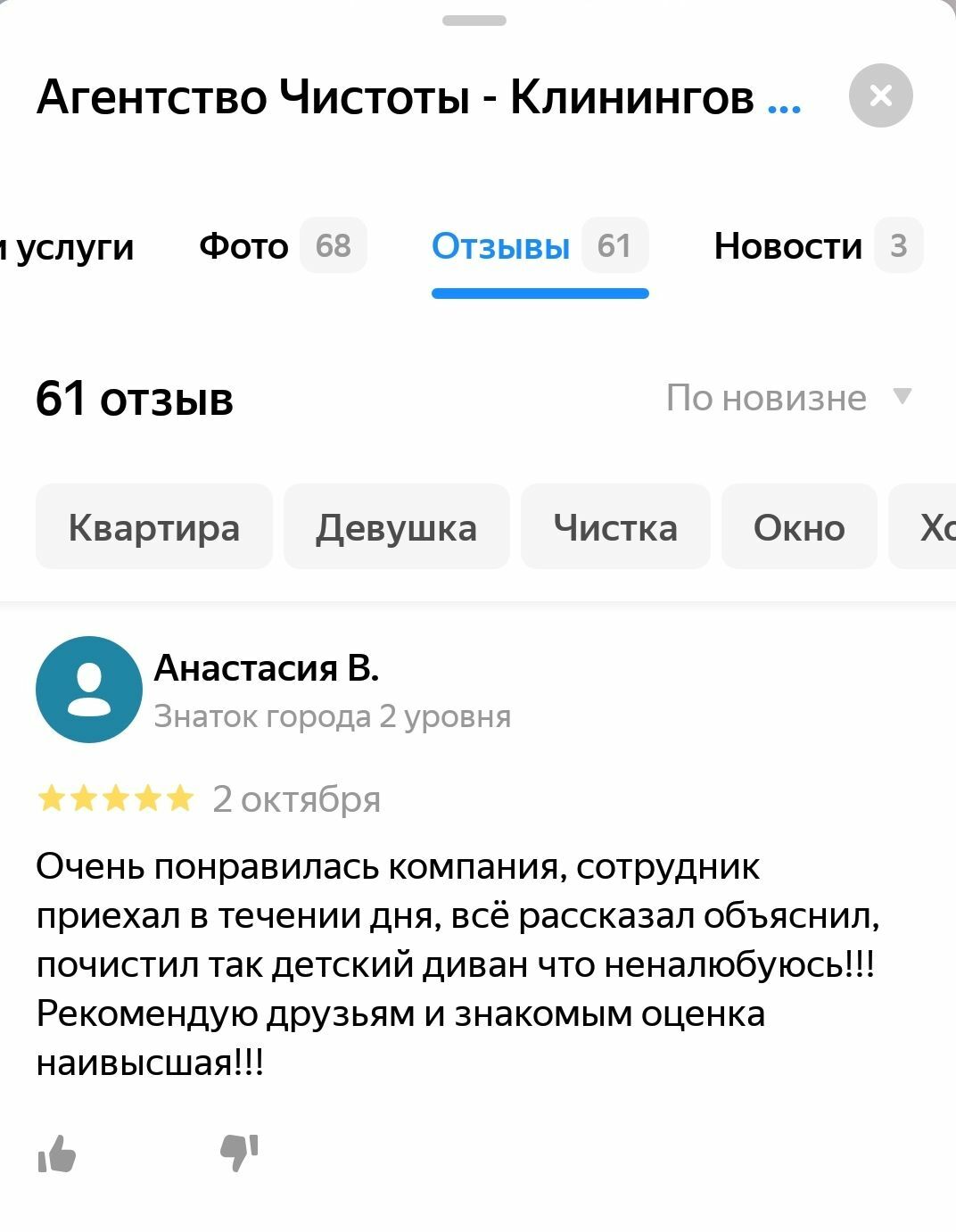 Очень понравилась компания, сотрудник приехал в течении дня, всё рассказал объяснил, почистил так детский диван что неналюбуюсь!!! Рекомендую друзьям и знакомым оценка наивысшая!!!