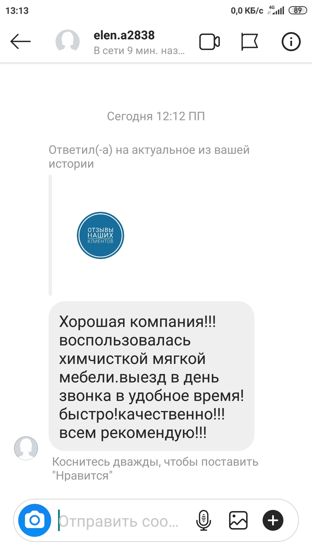 Хорошая компания!!! воспользовалась химчисткой мягкой мебели.выезд в день звонка в удобное время! быстро!качественно!!! всем рекомендую!!!