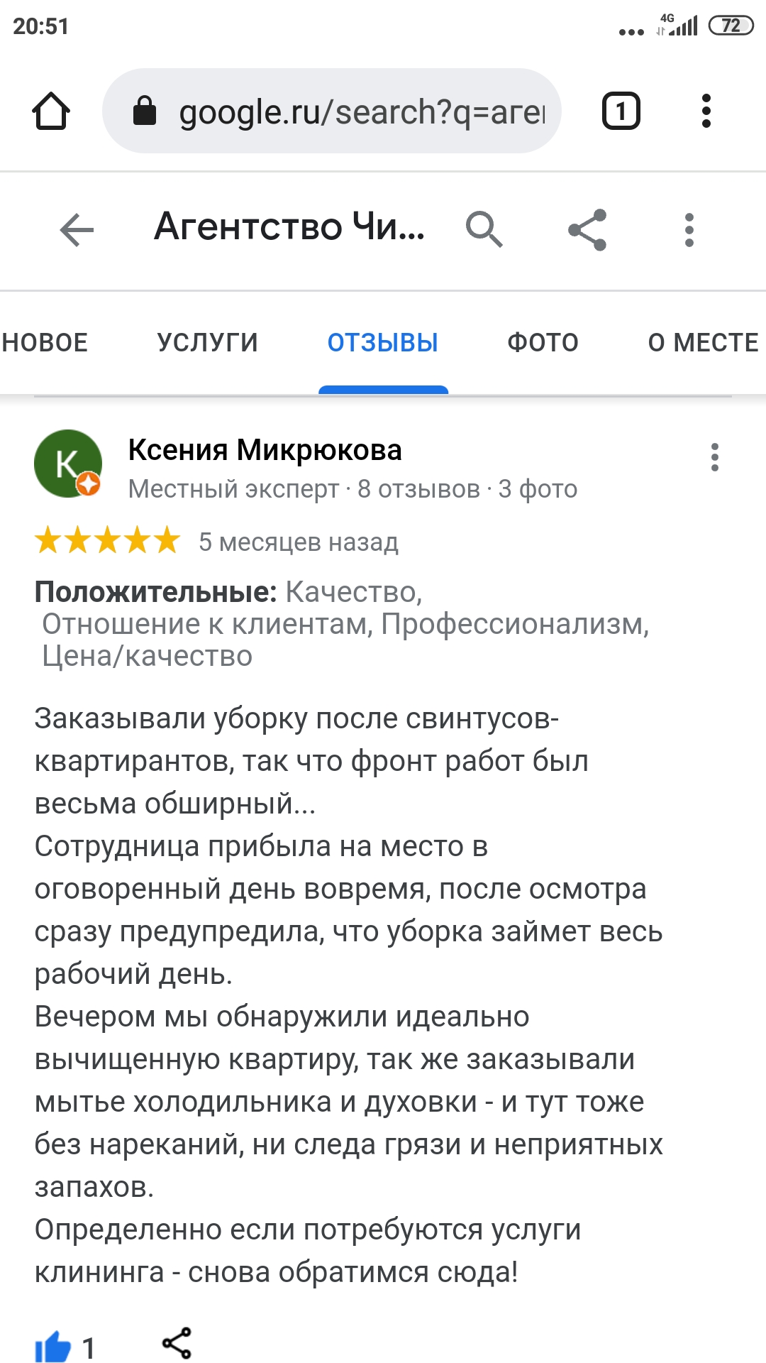 Заказывали уборку , так что фронт работ был весьма обширный.Вечером мы обнаружили идеально вычищенную квартиру, так же заказывали мытье холодильника и духовки - и тут тоже без нареканий, ни следа грязи и неприятных запахов.