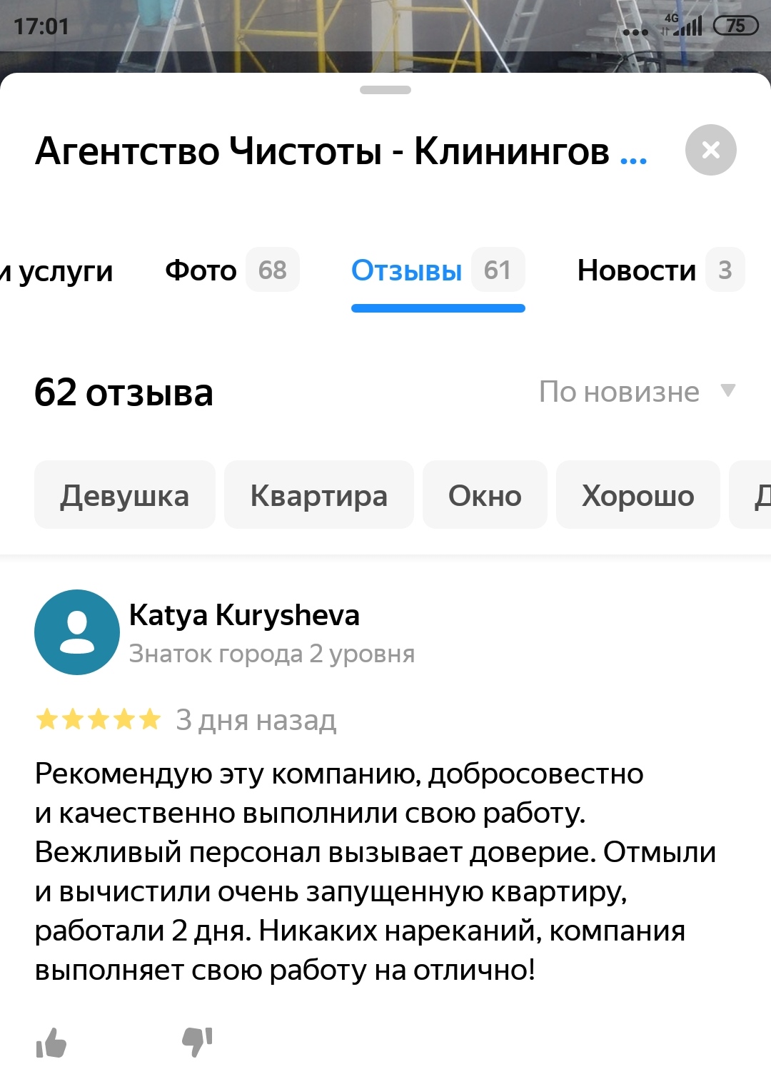 Вежливый персонал вызывает доверие. Отмыли и вычистили очень запущенную квартиру, работали 2 дня. Никаких нареканий, компания выполняет свою работу на отлично!