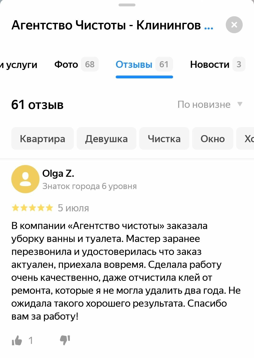 В компании «Агентство чистоты» заказала уборку ванны и туалета. Сделала работу очень качественно, даже отчистила клей от ремонта, которые я не могла удалить два года. Не ожидала такого хорошего результата. Спасибо вам за работу!