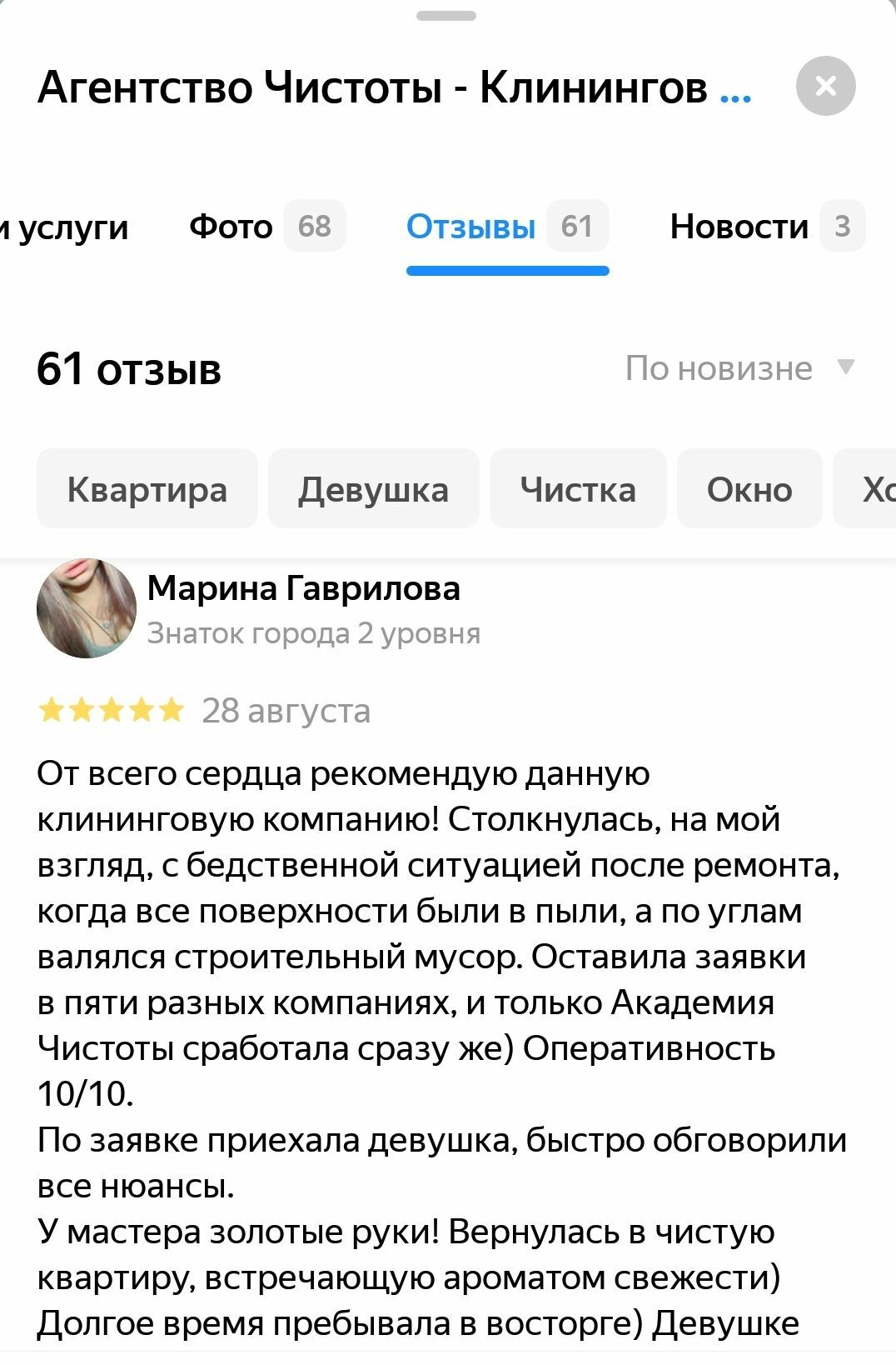 От всего сердца рекомендую данную клининговую компанию! Столкнулась, на мой взгляд, с бедственной ситуацией после ремонта, когда все поверхности были в пыли, а по углам валялся строительный мусор. Оперативность 10/10