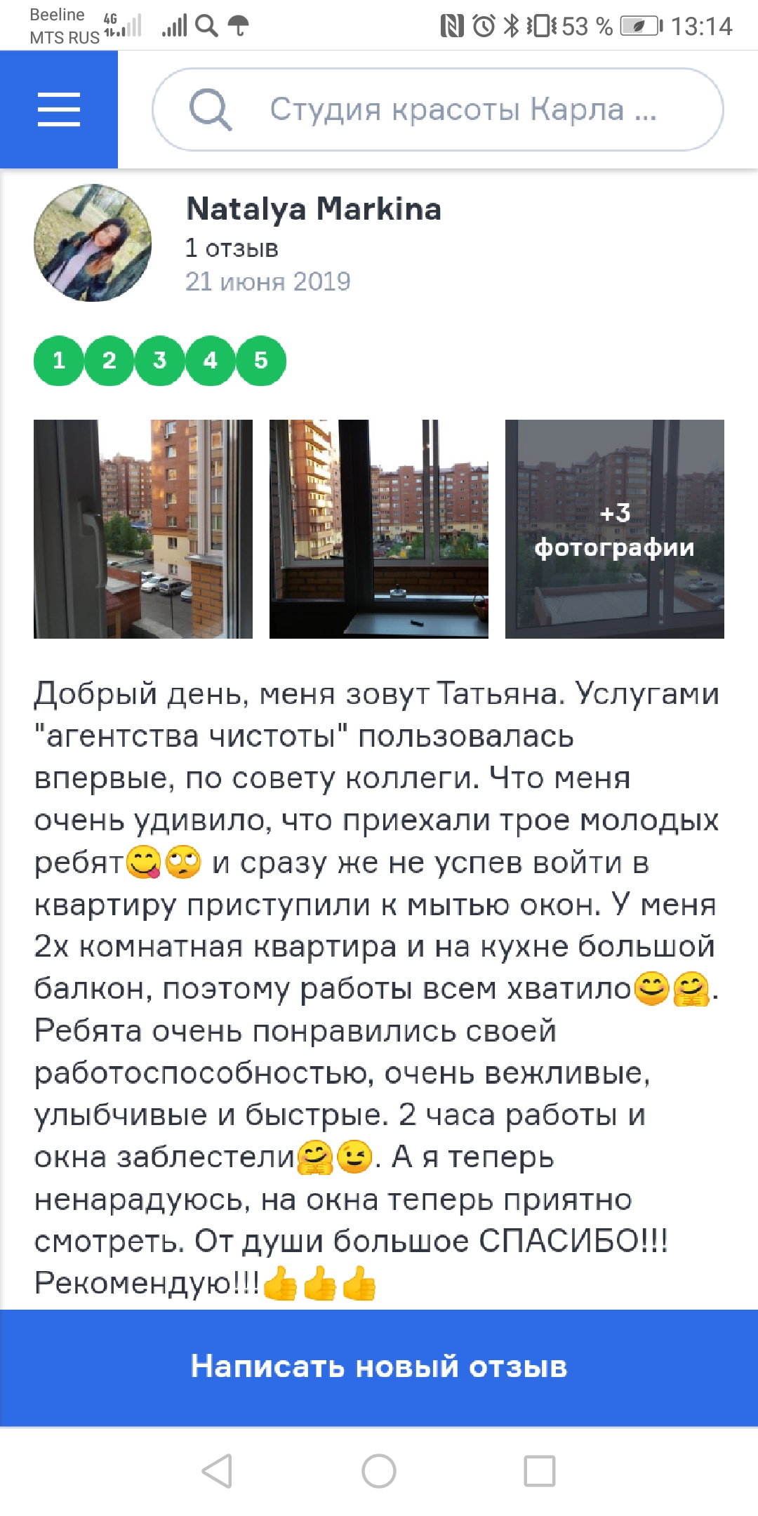 Добрый день, меня зовут Татьяна. Услугами "агентства чистоты" пользовалась впервые, по совету коллеги. Что меня очень удивило, что приехали трое молодых ребят и сразу же не успев войти в квартиру приступили к мытью окон.