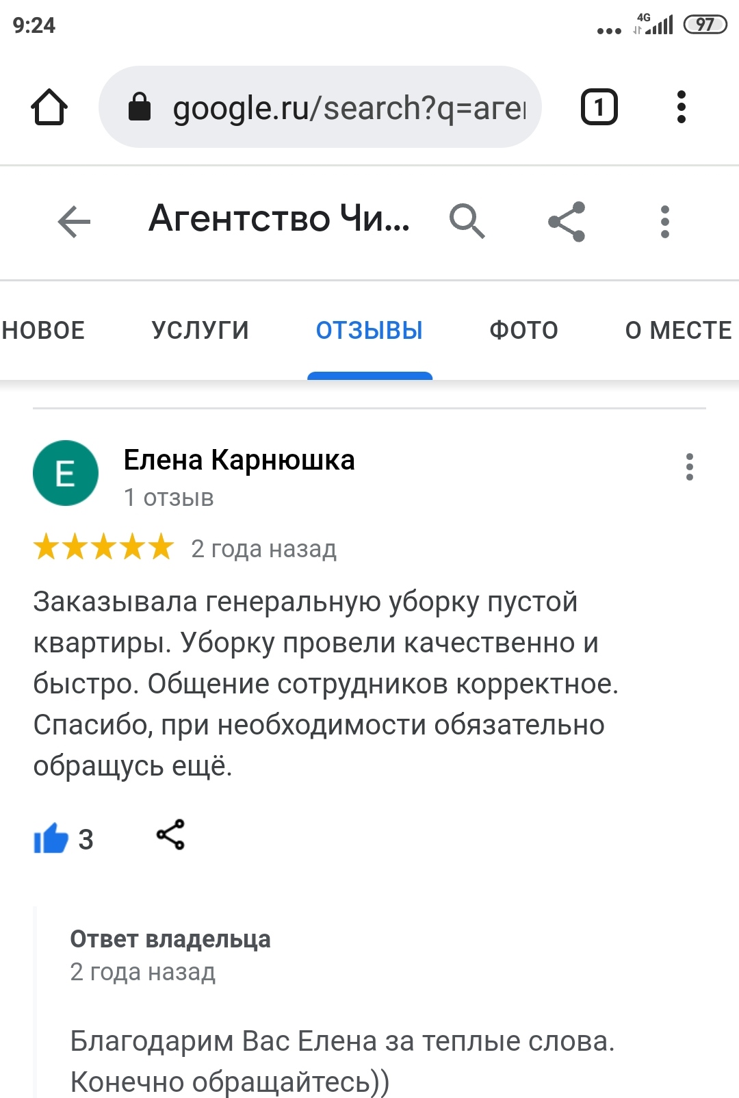 Заказывала генеральную уборку пустой квартиры. Уборку провели качественно и быстро. Общение сотрудников корректное. Спасибо, при необходимости обязательно обращусь ещё.
